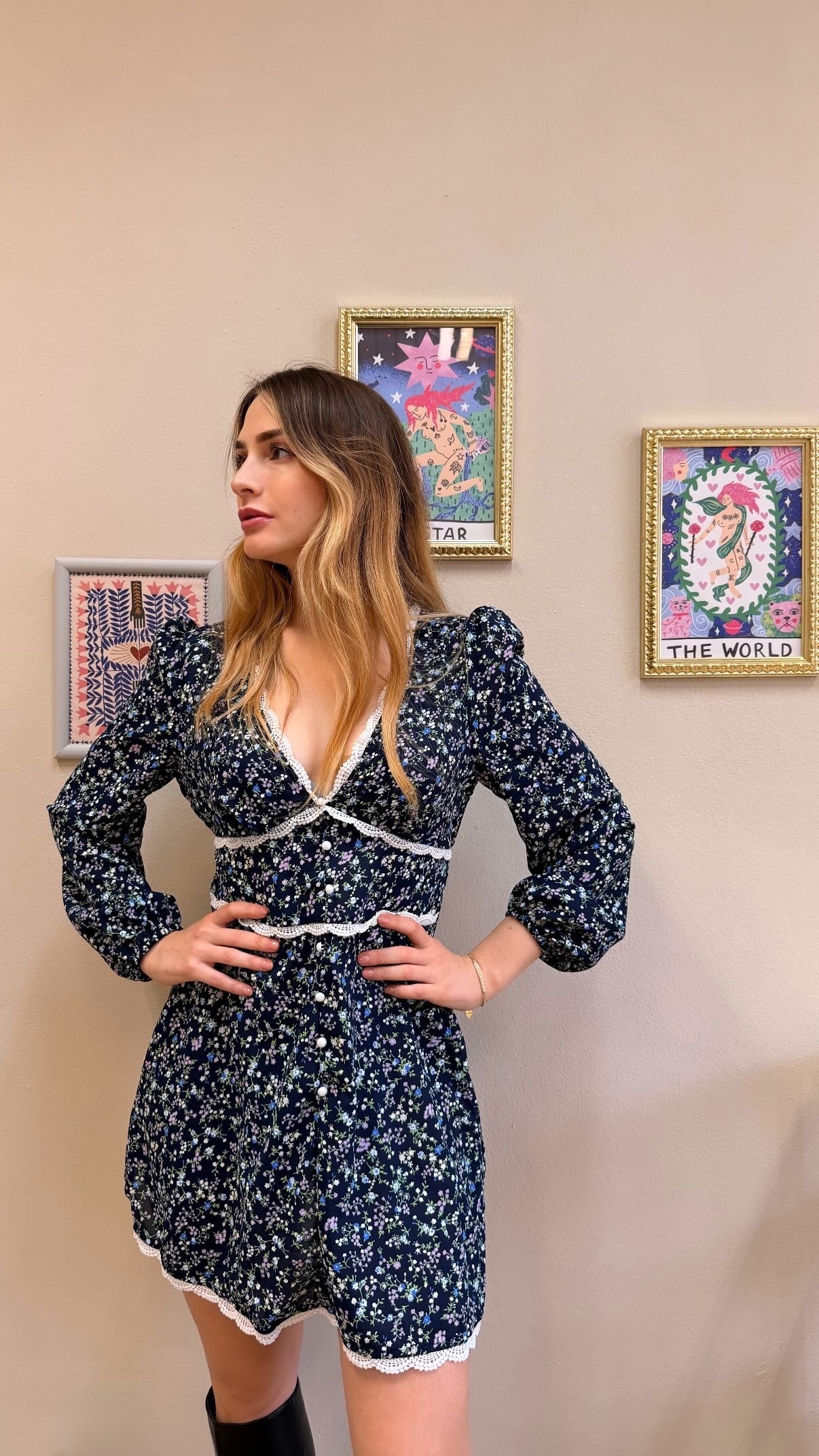 Abitino leggero primaverile Blu scuro con fiorellini e ricamo merlettato bianco