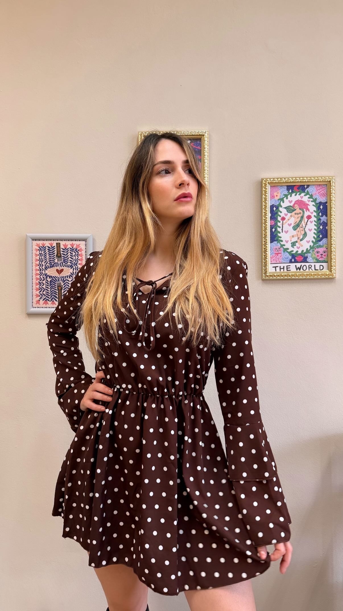 Abito Pois color cioccolato manica a campana chiusura laccetto sul petto