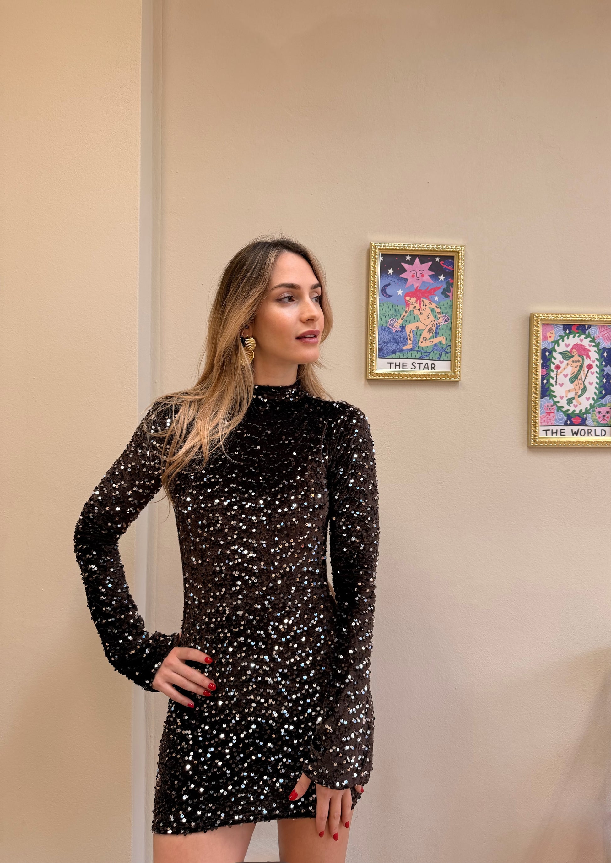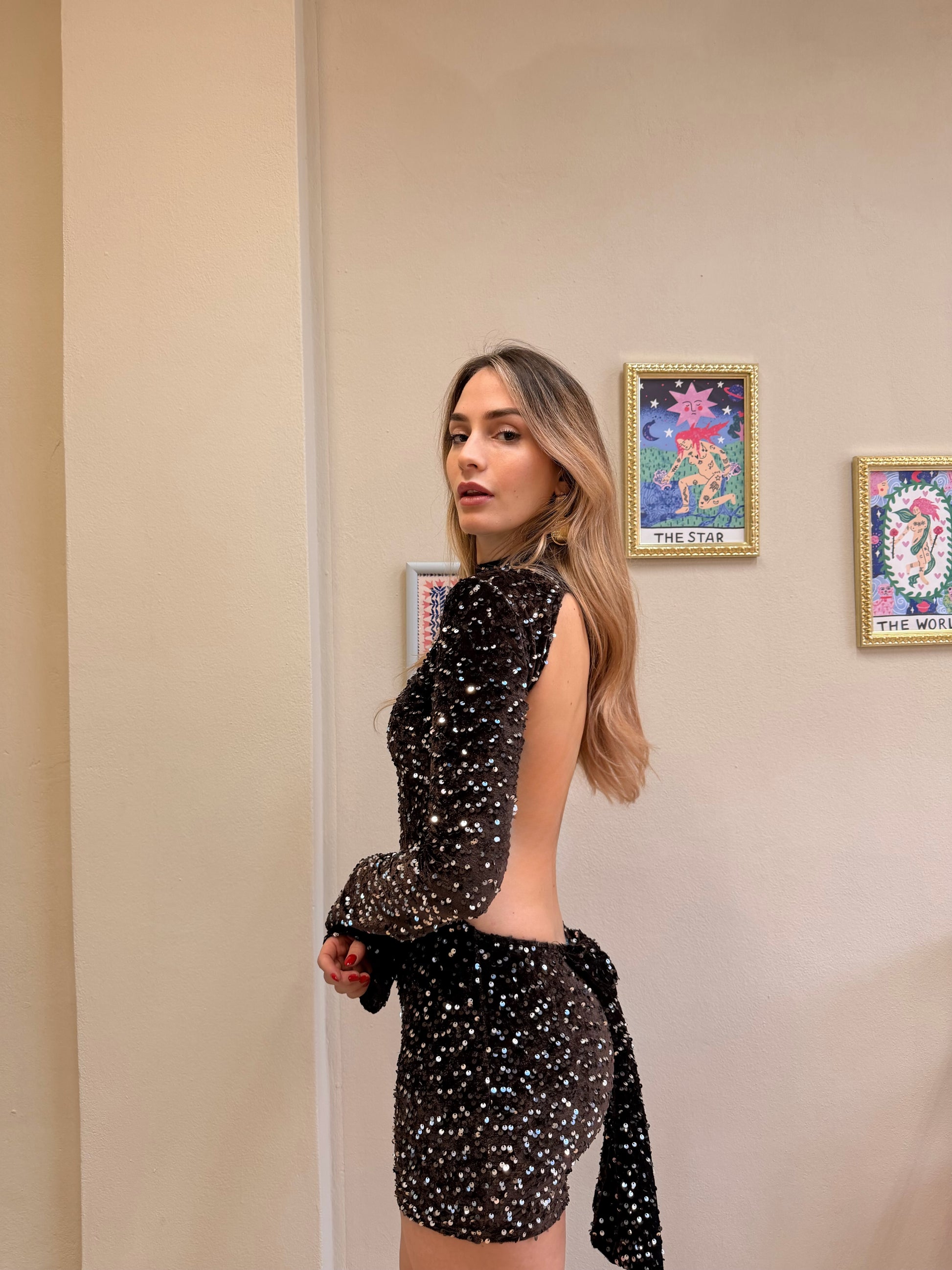 dress paillettes con base vellutino morbido color cioccolato collarino con 3 bottoncini posteriori scollo profondo schiena con fiocco
