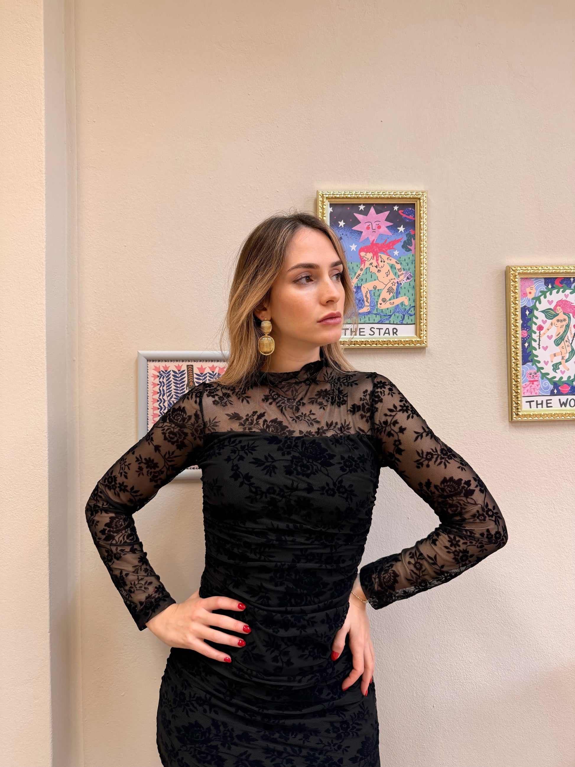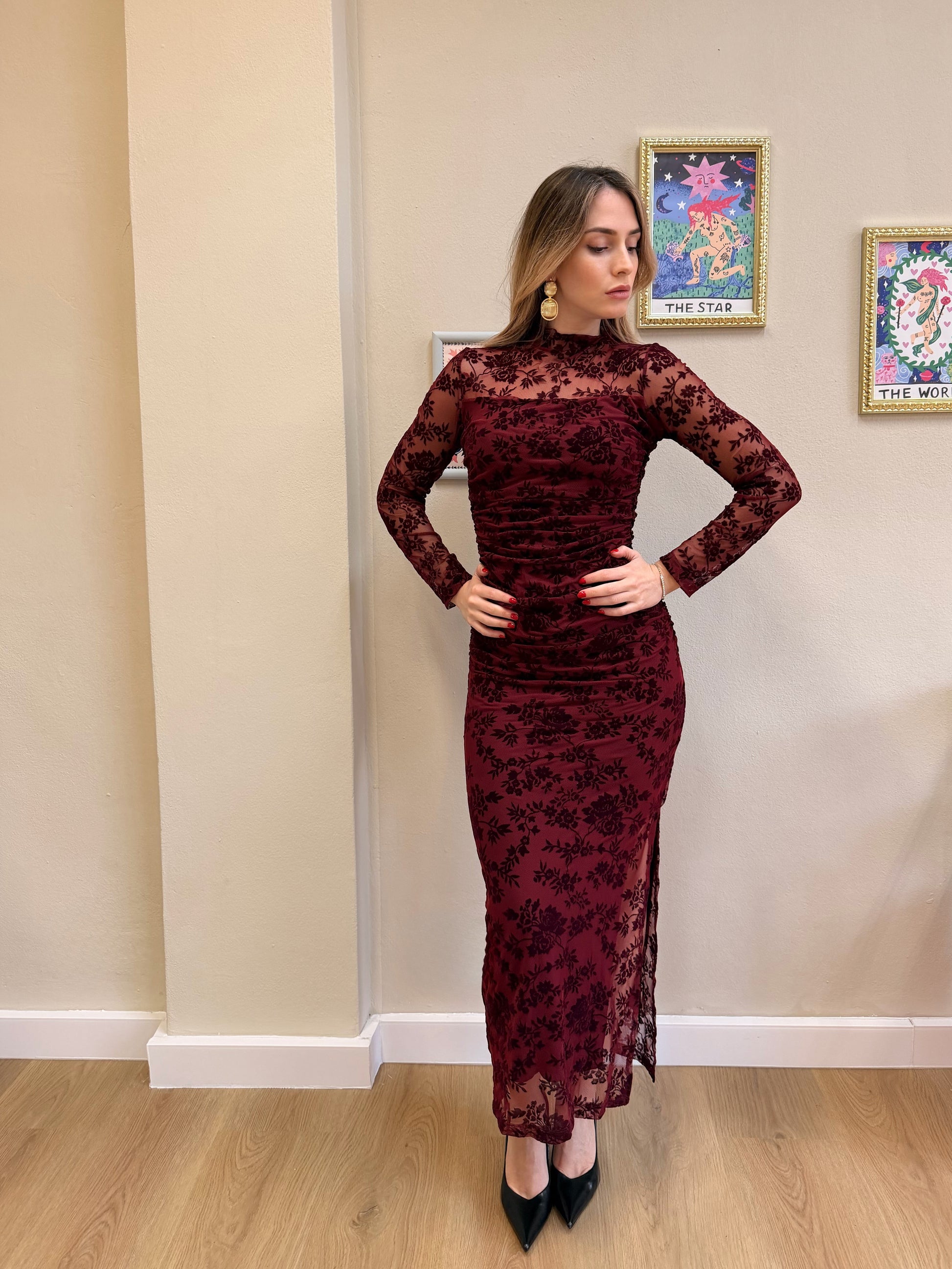 Abito lungo velato con decorazioni floreali in rilievo in velluto drappeggiato sui fianchi